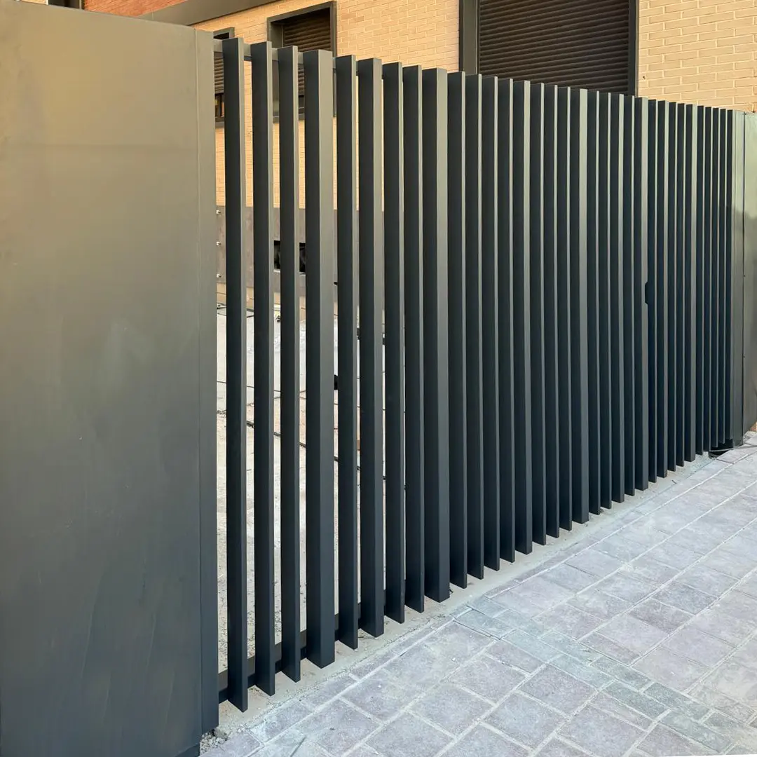 Descubre nuestra puerta corredera de diseño contemporáneo, caracterizada por sus elegantes lamas verticales en un sofisticado color gris antracita. Esta solución es ideal para entradas de edificios residenciales, comunidades de vecinos, garajes o propiedades con un estilo vanguardista en entornos urbanos. No solo optimiza el espacio gracias a su sistema corredero, sino que también ofrece una estética depurada y una seguridad inigualable.