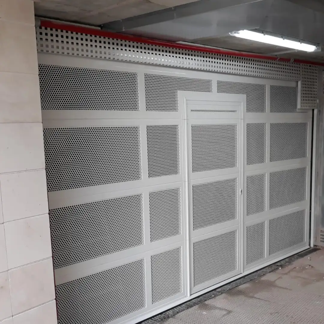 Puerta seccional, diseñada con paneles de chapa perforada para una ventilación óptima y la inclusión estratégica de una puerta auxiliar peatonal. Esta solución es ideal para garajes comunitarios, aparcamientos comerciales, o cualquier espacio que requiera una constante renovación de aire sin comprometer la seguridad. Su diseño funcional y robusto la convierte en la opción perfecta para cumplir con normativas de ventilación y facilitar el acceso de personas.